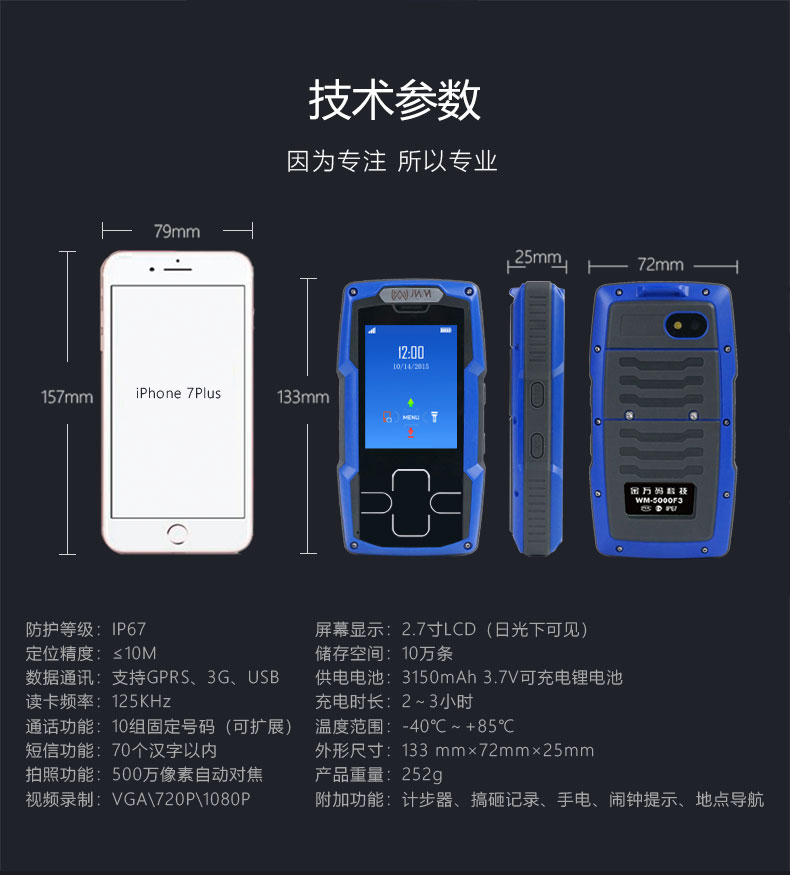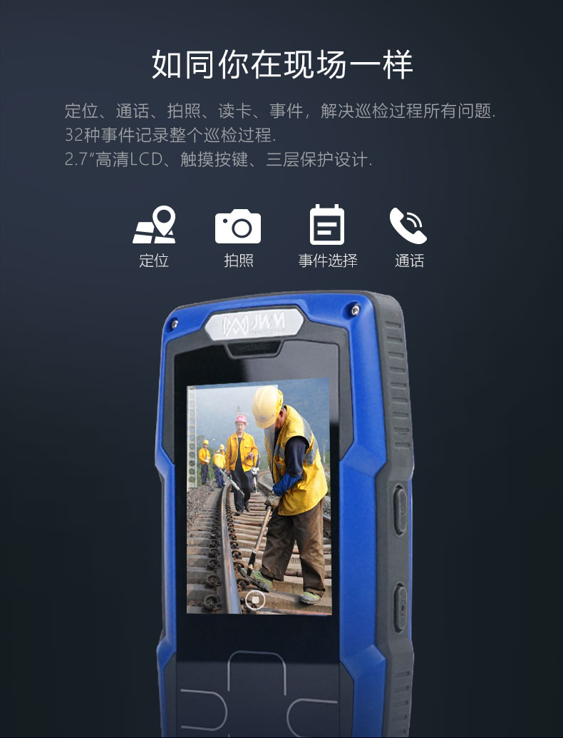 定位、通話、拍照、讀卡、事件,解決巡檢過程所有問題32種事件記錄整個(gè)巡檢過程2.7“高清LCD、觸摸按鍵、三層保護(hù)設(shè)計(jì)