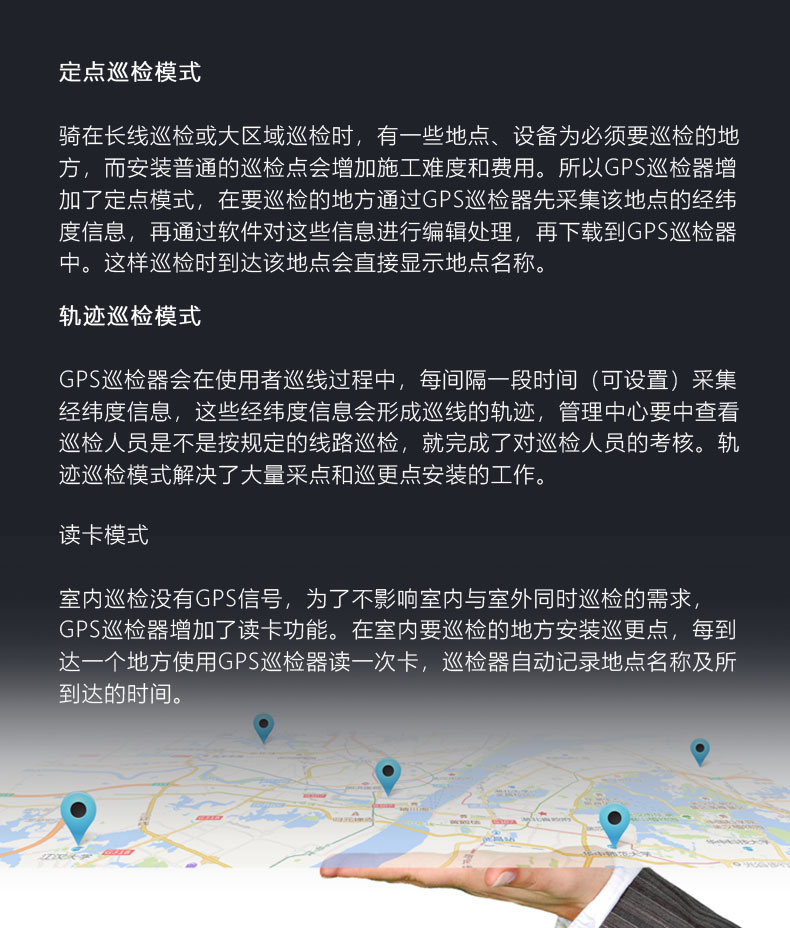 在在長線巡檢或大區(qū)域巡檢時(shí),有一些地點(diǎn)、設(shè)備為必須要巡檢的地方,而安裝普通的巡檢點(diǎn)會(huì)增加施工難度和費(fèi)用。所以GPS巡檢器增加了定點(diǎn)模式,在要巡檢的地方通過GPS巡檢器先采集該地點(diǎn)的經(jīng)緯度信息,再通過軟件對這些信息進(jìn)行編輯處理,再下載到GPS巡檢器中。這樣巡檢時(shí)到達(dá)該地點(diǎn)會(huì)直接顯示地點(diǎn)名稱。