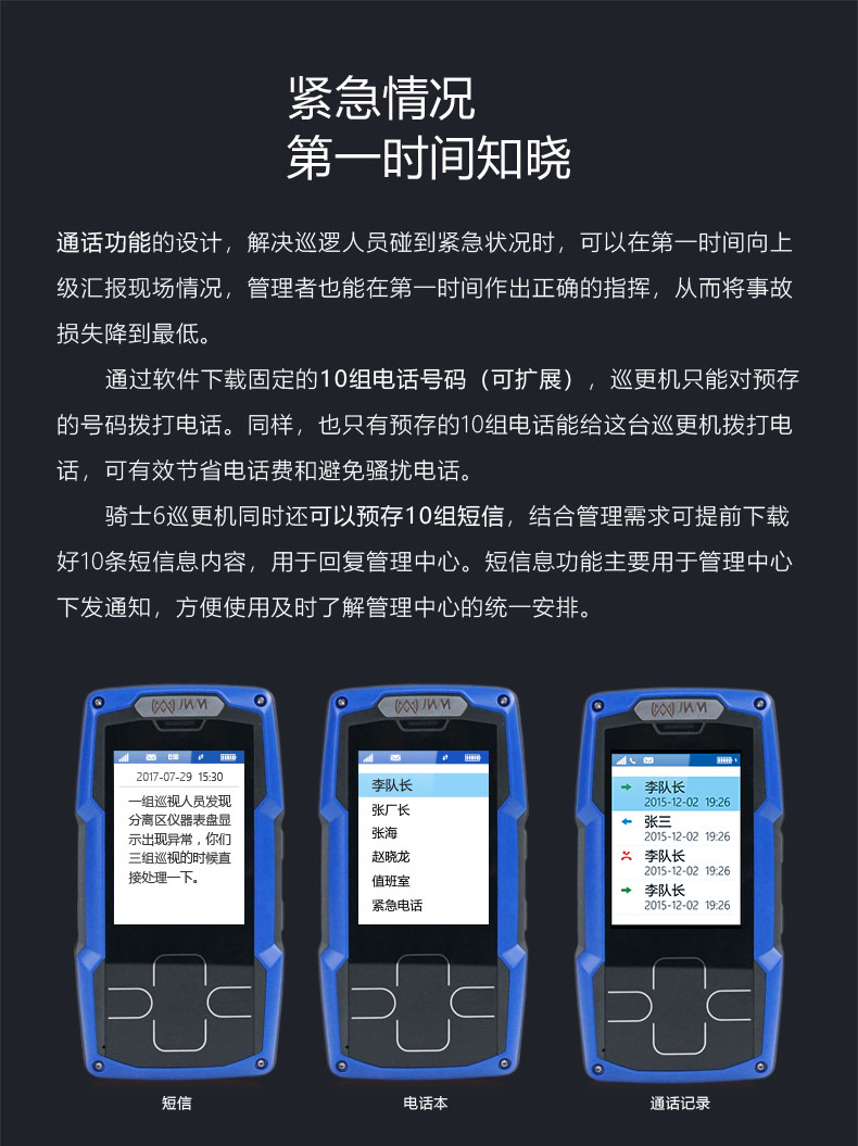通話功能的設(shè)計(jì),解決巡檢人員碰到緊急狀況時(shí),可以在第一時(shí)間向上級(jí)匯報(bào)現(xiàn)場情況,管理者也能在第一時(shí)間作出正確的指揮,從而將事故損失降到最低。 通過軟件下載固定的10組電話號(hào)碼(可擴(kuò)展),巡檢器只能對預(yù)存的號(hào)碼撥打電話。同樣,也只有預(yù)存的10組電話能給這臺(tái)巡更機(jī)撥打電話,可有效節(jié)省電話費(fèi)和避免騷擾電話。 北極星6GPS巡檢器同時(shí)還可預(yù)存10組短信,結(jié)合管理需求可提前下載好10條短信息內(nèi)容,用于回復(fù)管理中心。短信息功能主要用于管理中心下發(fā)通知,方便使用及時(shí)了解管理中心的統(tǒng)一安排。