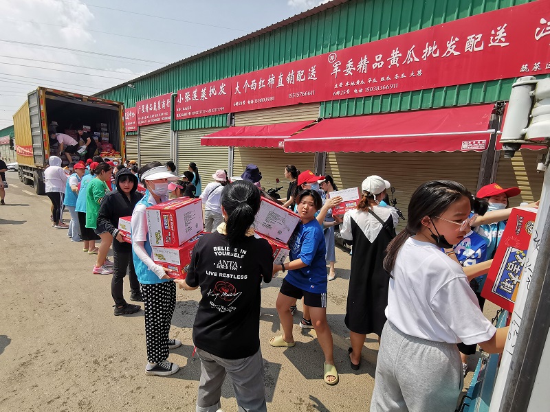 十八里河農產品配送中心合作方、中歐國際工商學院校友郭高亮呼吁社會愛心人士等以實際行動支持鄭州防汛救災。倡議發出后,來自北京、上海、深圳、香港等地捐贈的礦泉水、方便面、面包、蔬菜水果、常用藥等價值1200余萬元的愛心物資在十八里河農產品配送中心協調中轉,公司迅速動員全系統黨員干部職工并向社會招募愛心人士300多人忍受著高溫難耐、空氣流通不暢等惡劣條件,晝夜不停開展物資搬運、中轉、發放志愿服務,先后奔赴惠濟區迎賓路街道辦事處、鄭東新區金光路街道辦事處、中原區市場街78號院、管城區紅十字會、金水區鄭汴路玉鳳路救援現場,黃河農場、中牟白沙鎮、白沙鎮淄博救援隊救援現場、鞏義市米河鎮、登封滎陽新密等受災地區以及戰斗在一線的公安和消防隊員,共送出500余萬元愛心物資。